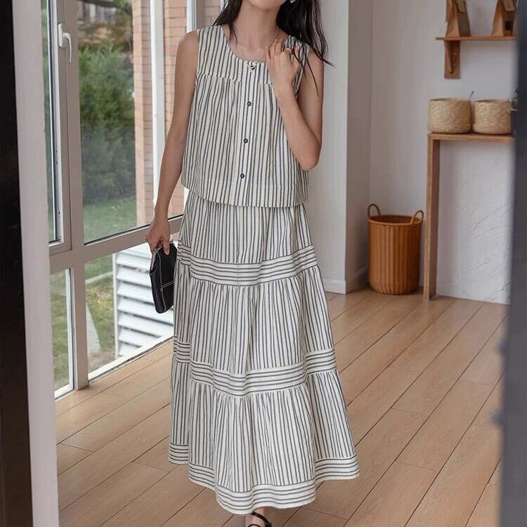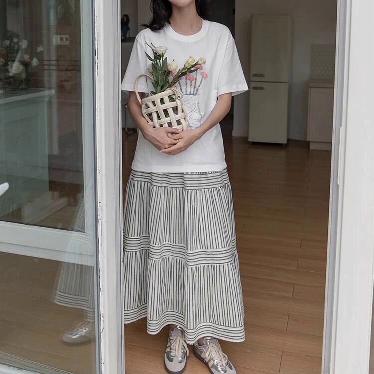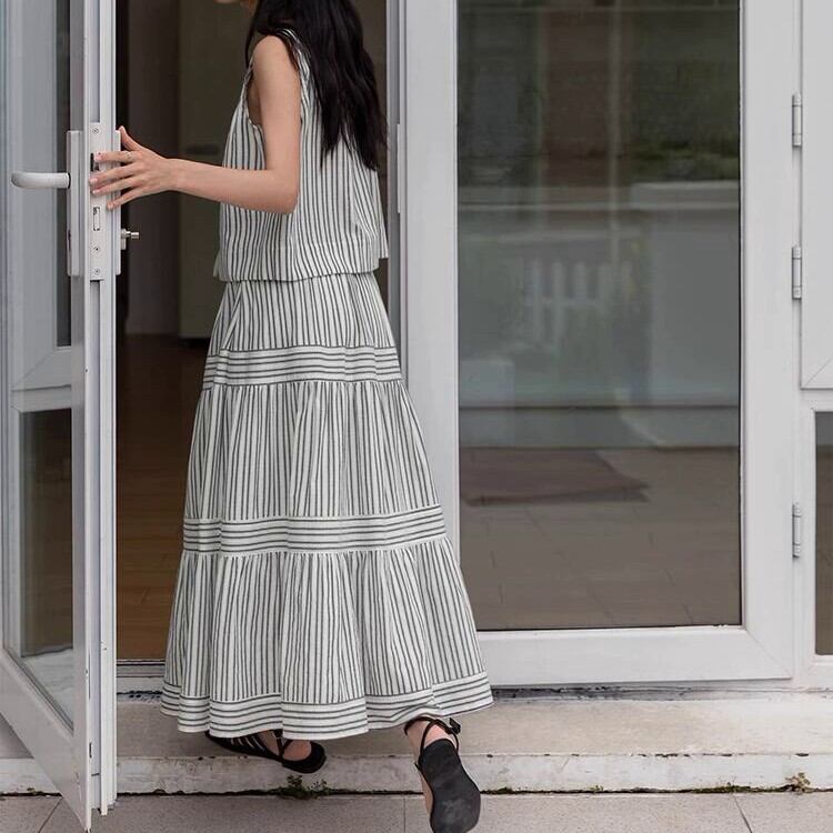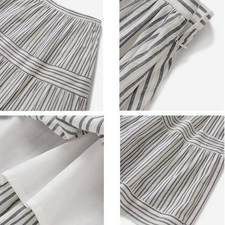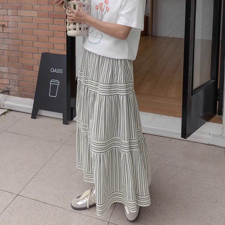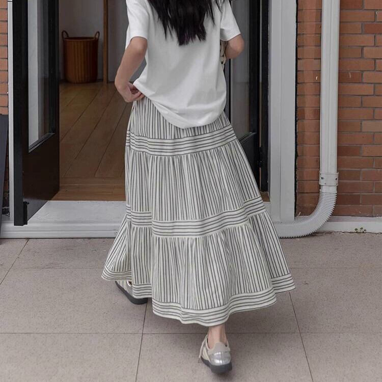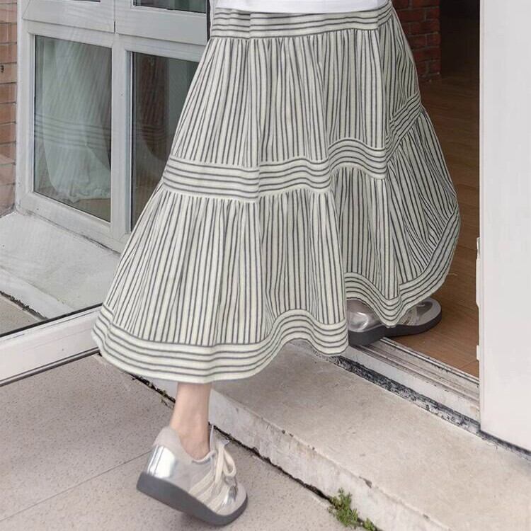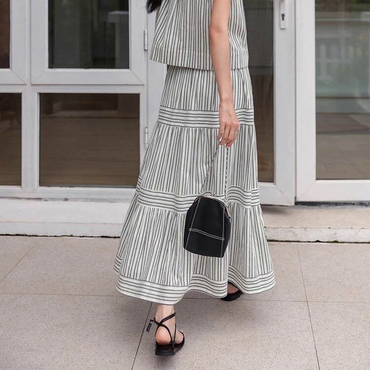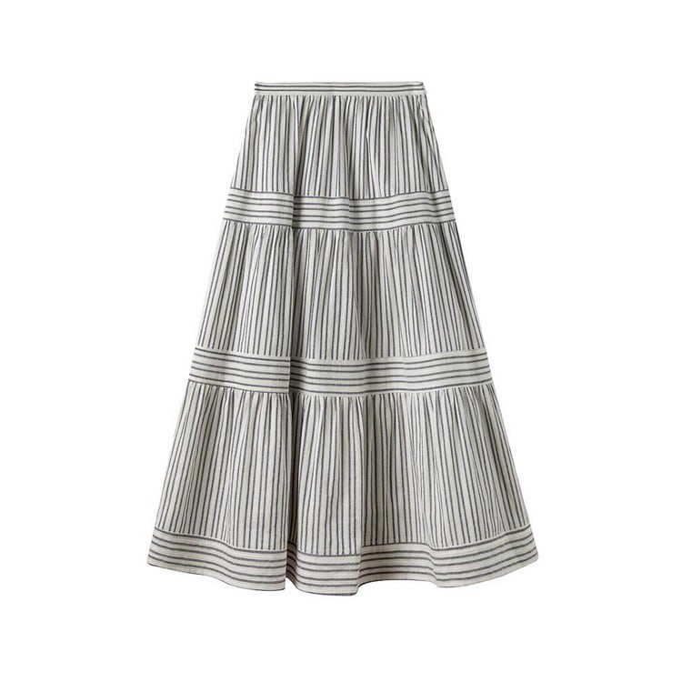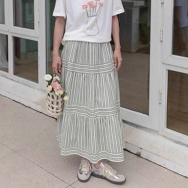 歩くたびにドラマティックに揺れる、ストライプパネルティアードスカート。