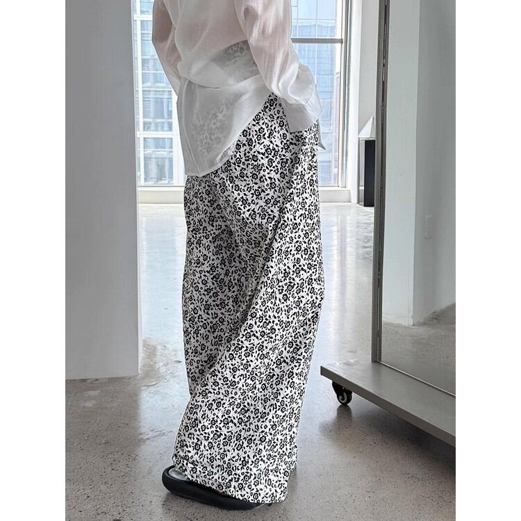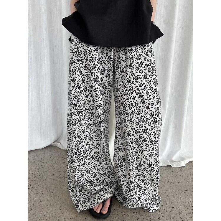 小ぶりな花柄が上品な印象を与える、モノトーンのワイドパンツです。
