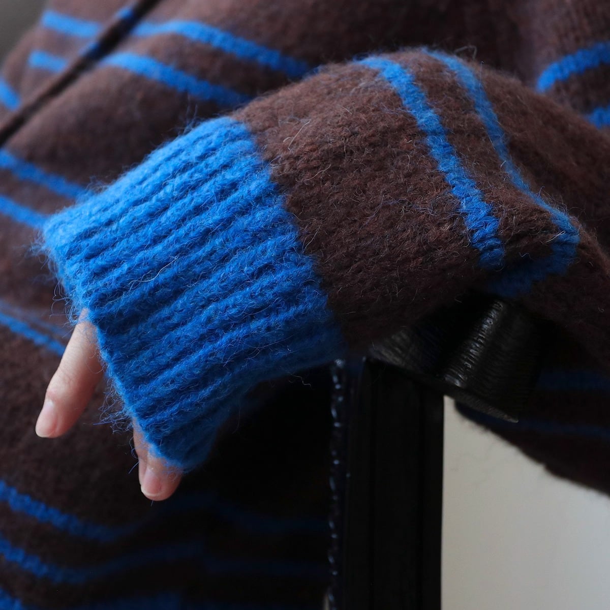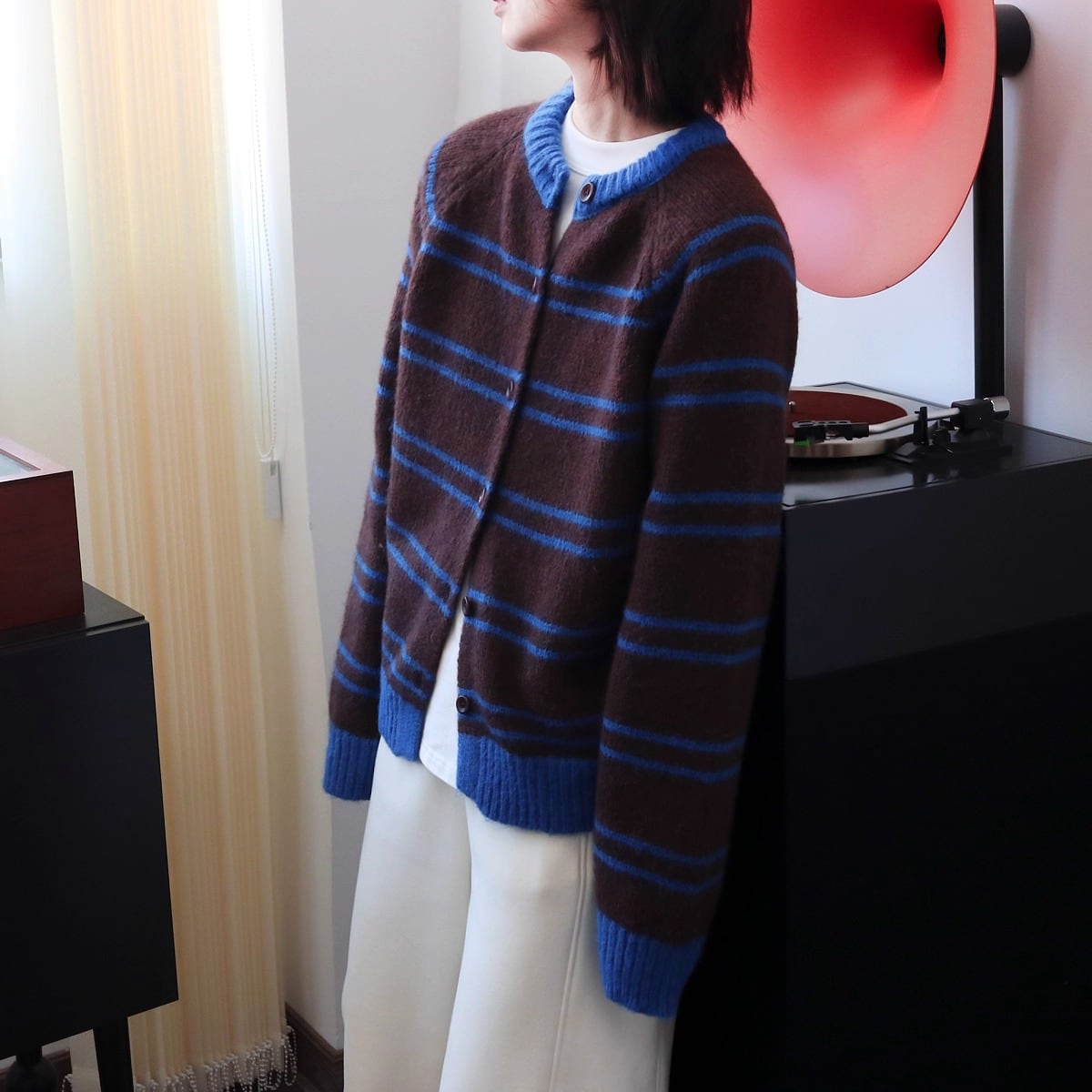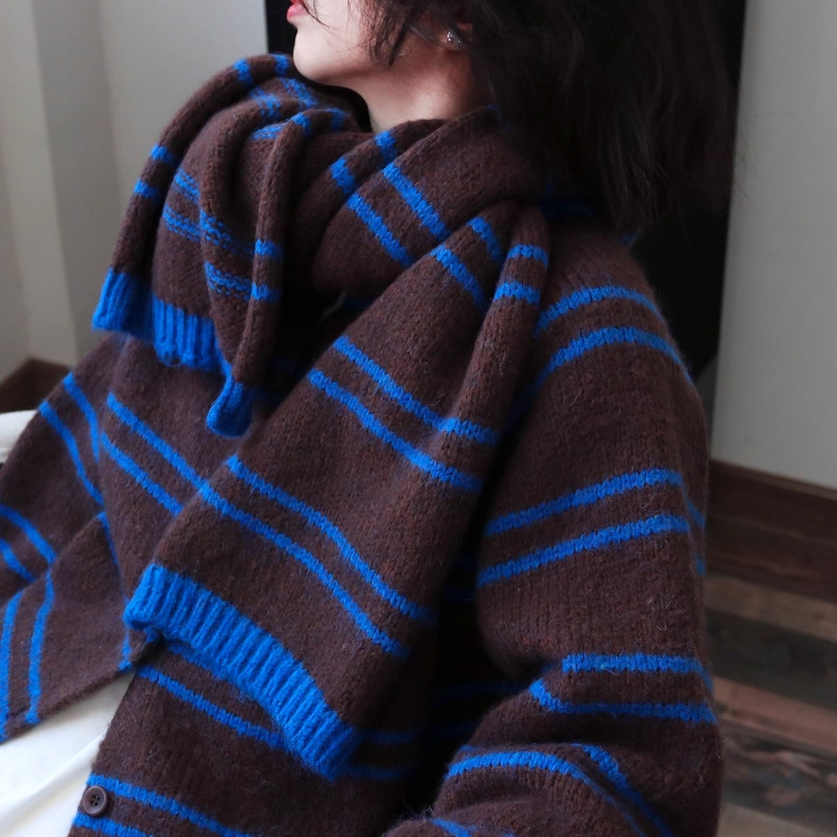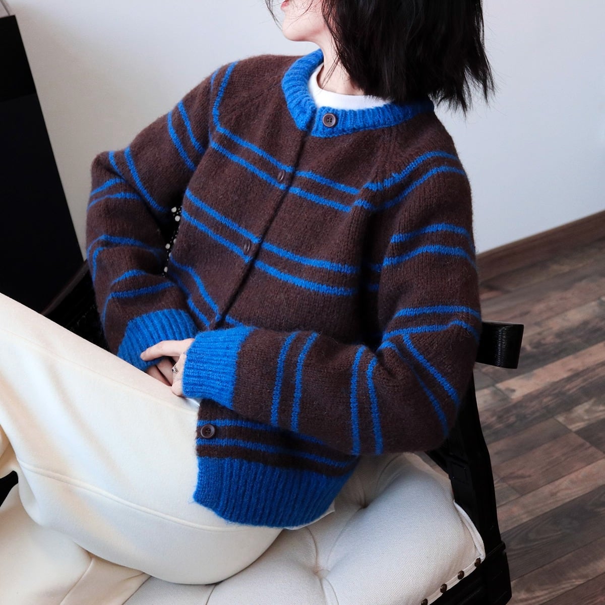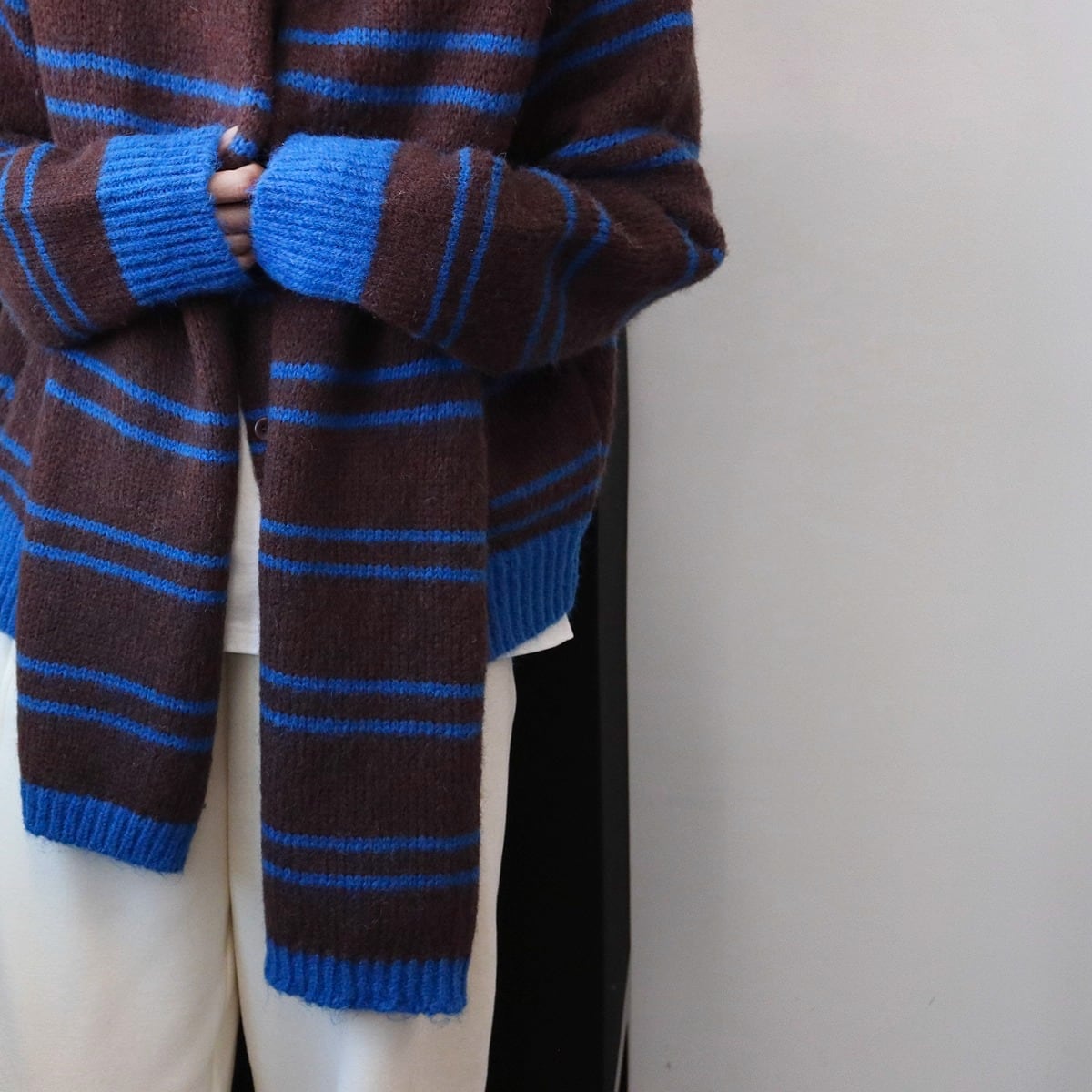 ボーダー柄が魅力的なニットカーディガンです。