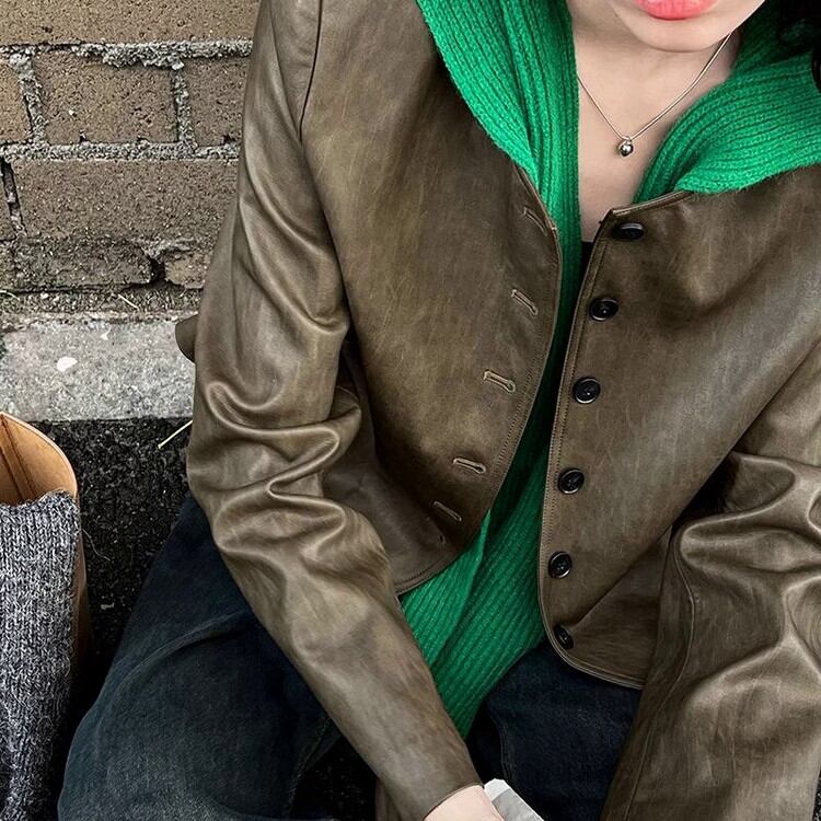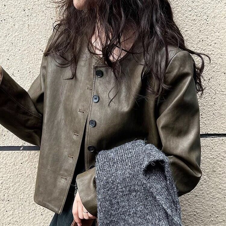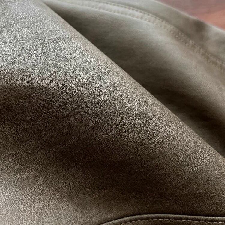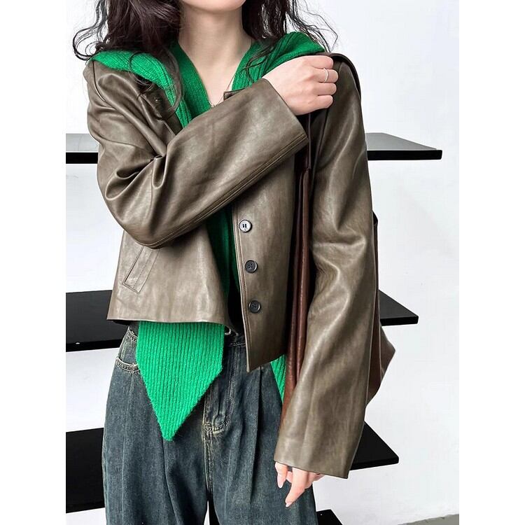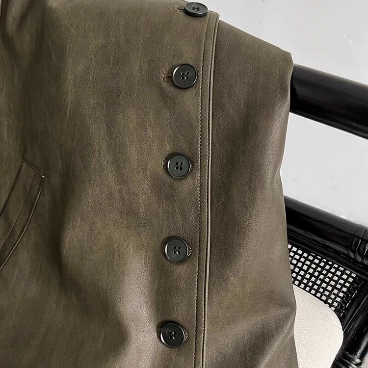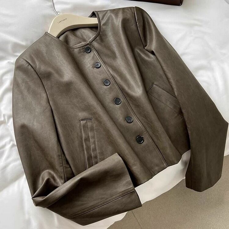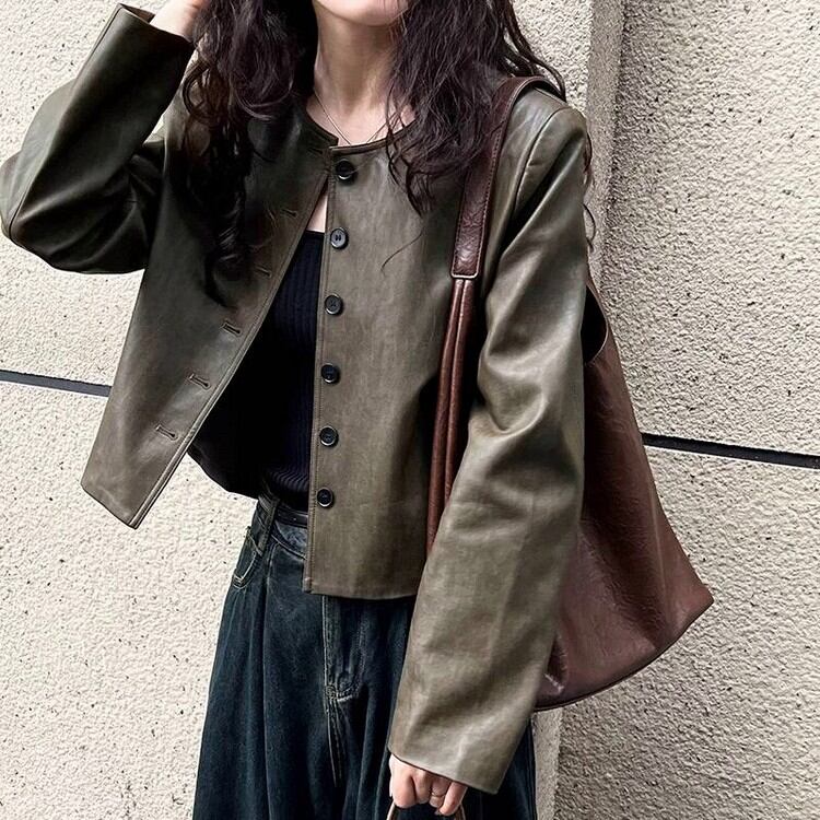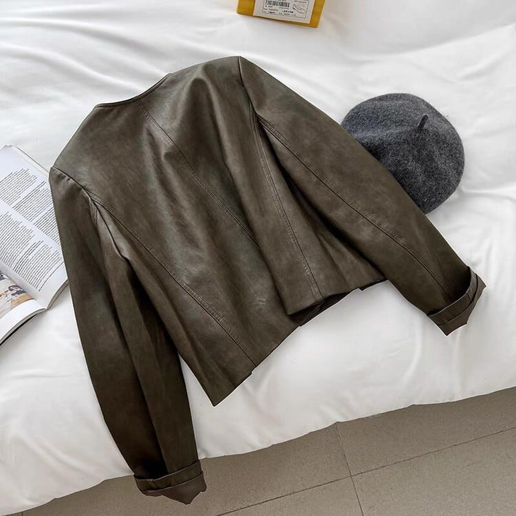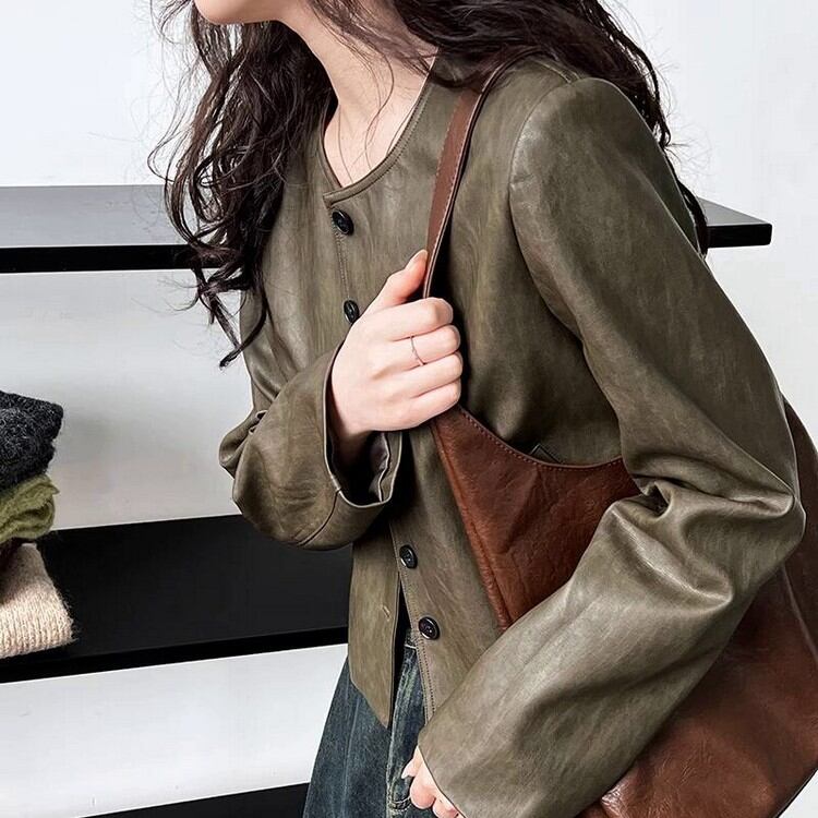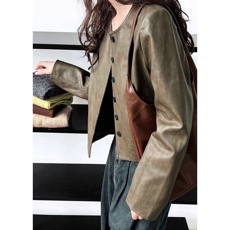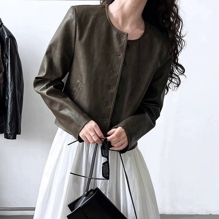 今季のトレンドであるフェイクレザーを、取り入れやすいノーカラーデザインで仕上げました。