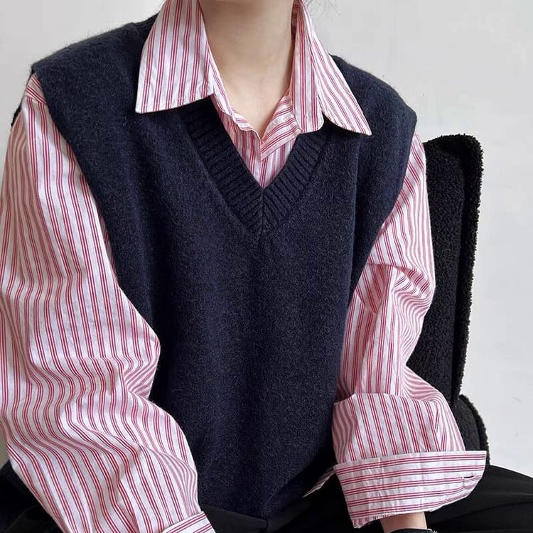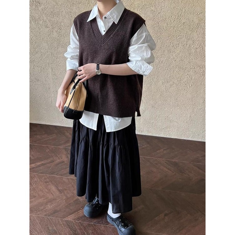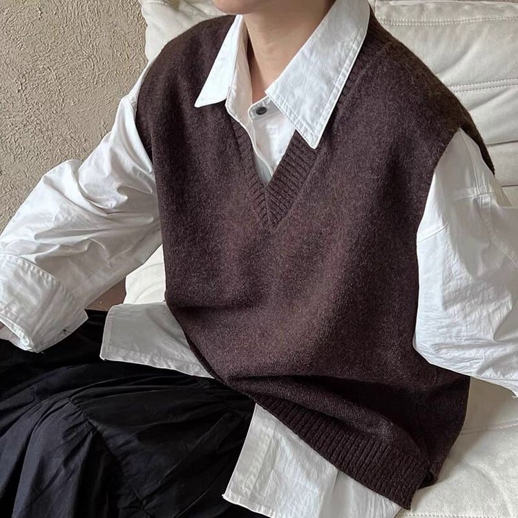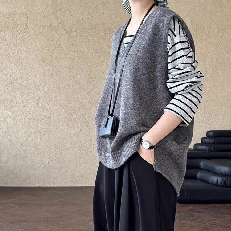 深めのVネックとゆったりとしたルーズフィットが、レイヤードスタイルを美しく見せます。