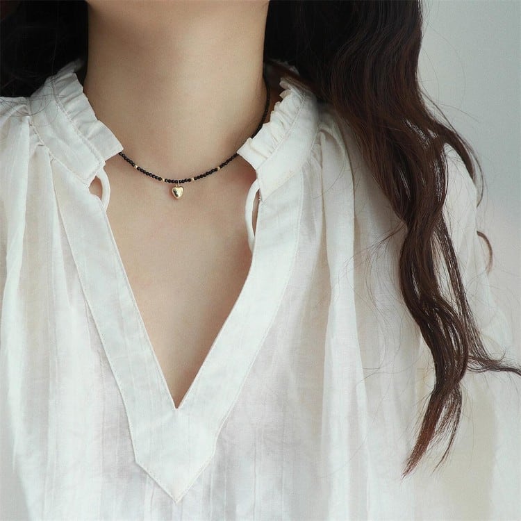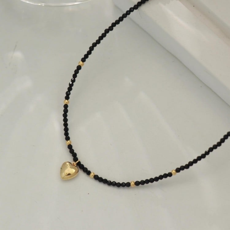 シックなブラックビーズに、ぷっくりとしたゴールドのハートモチーフが光るチョーカー。