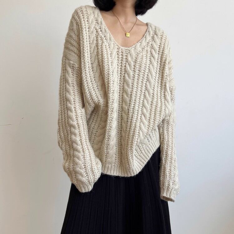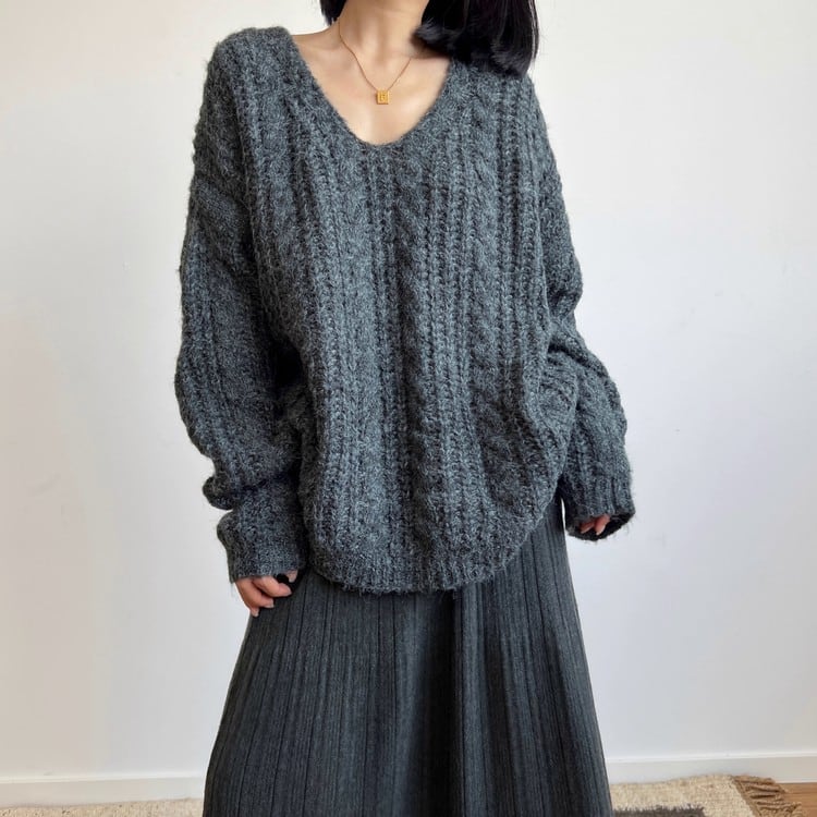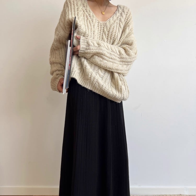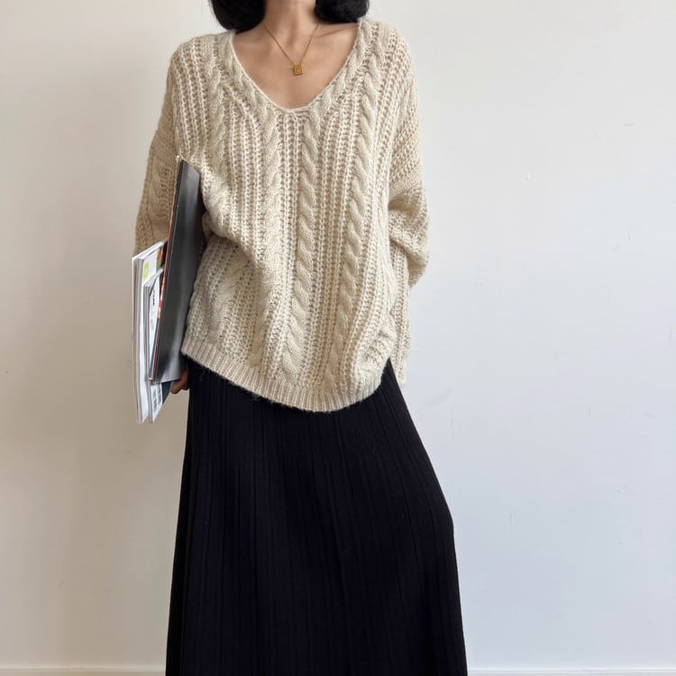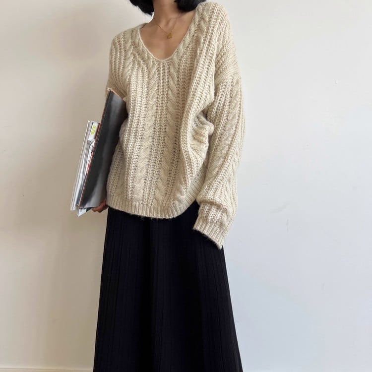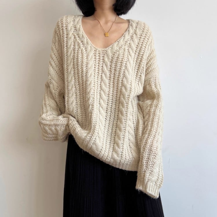 深めに開いたVネックは、顔まわりをすっきりと見せてくれます。